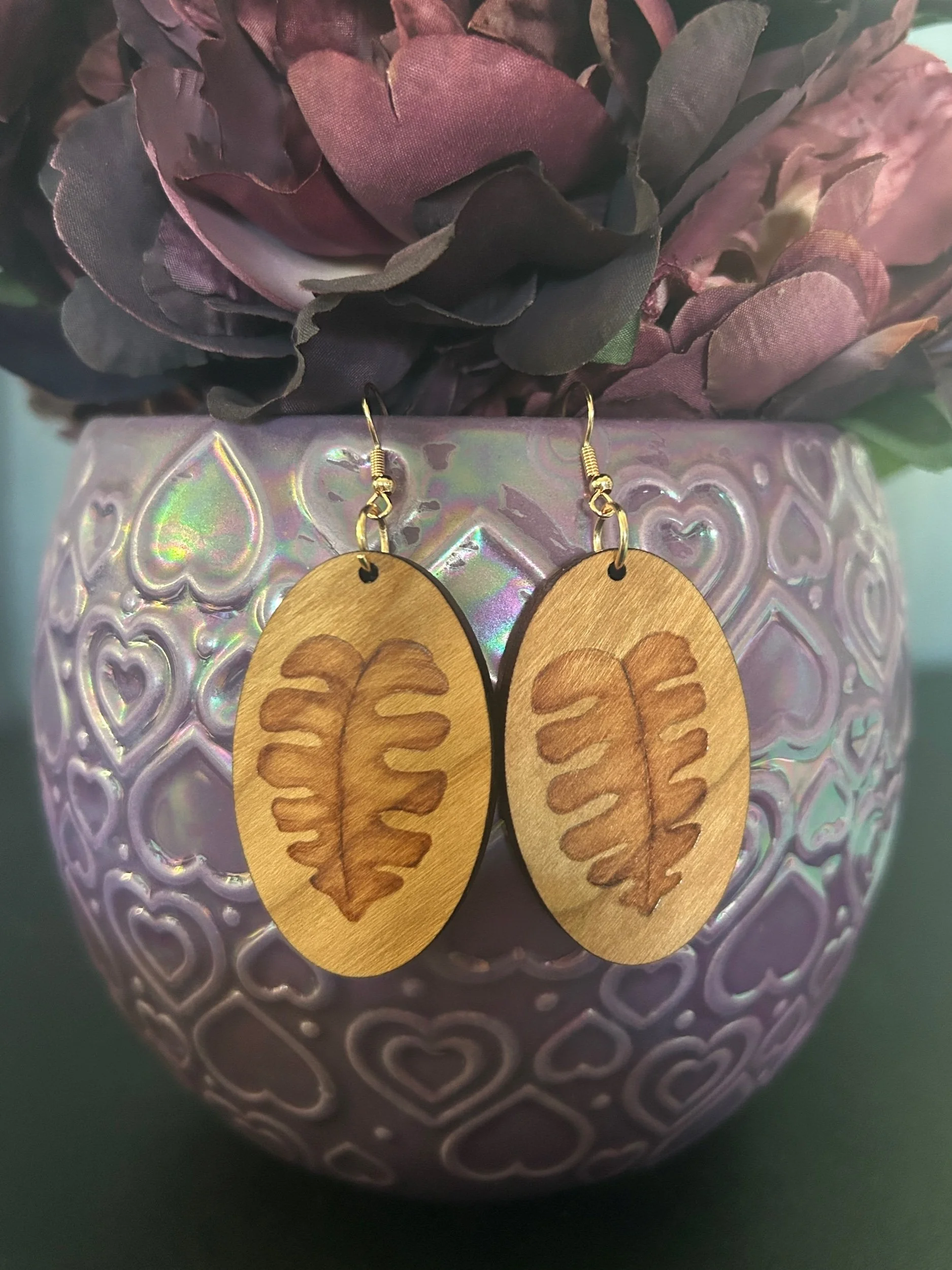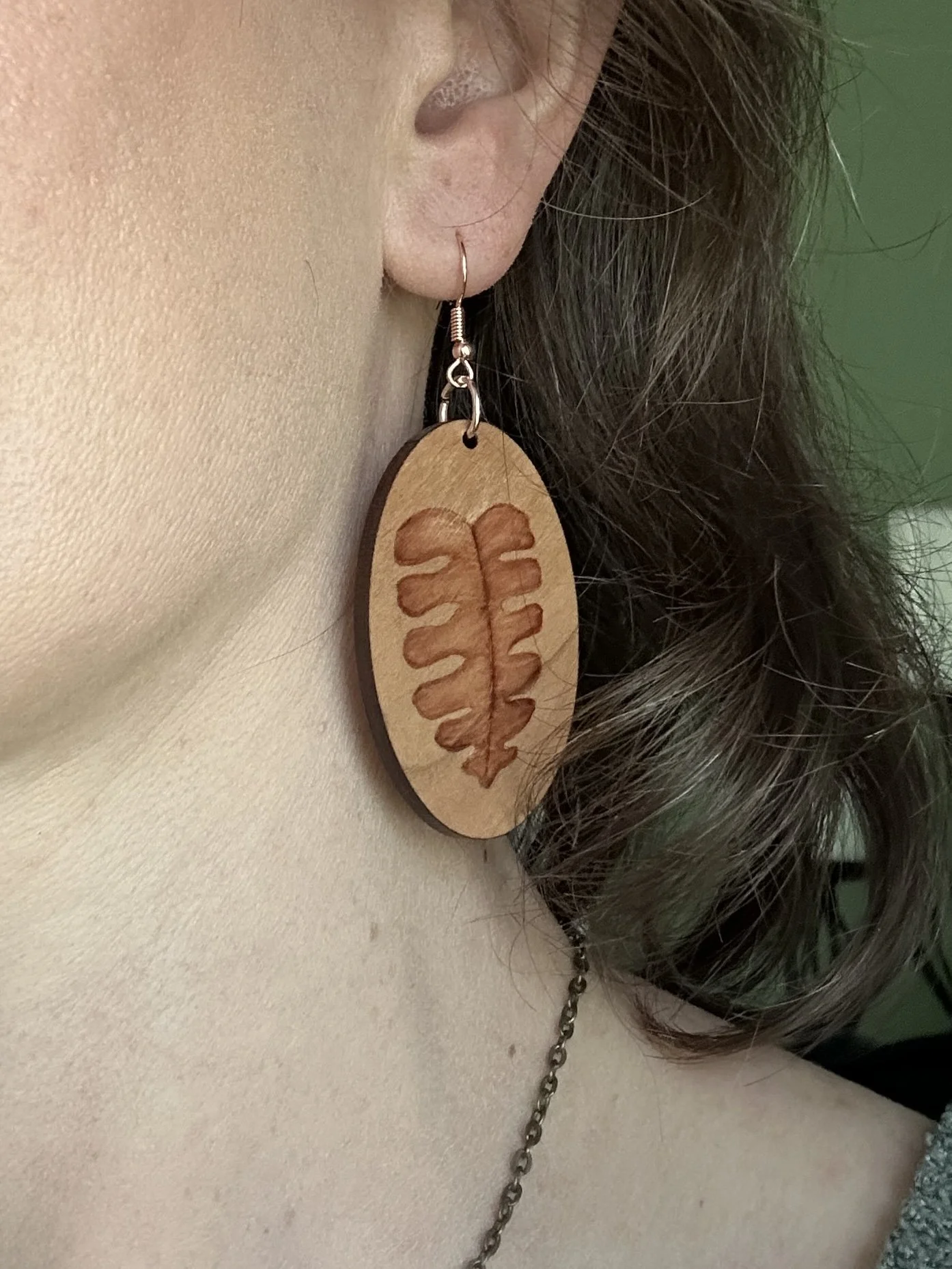 The wood pendants measure two inches long by 1.25 inches wide and are lightweight. The hooks are rose gold colored and nickel free. Backs are included.