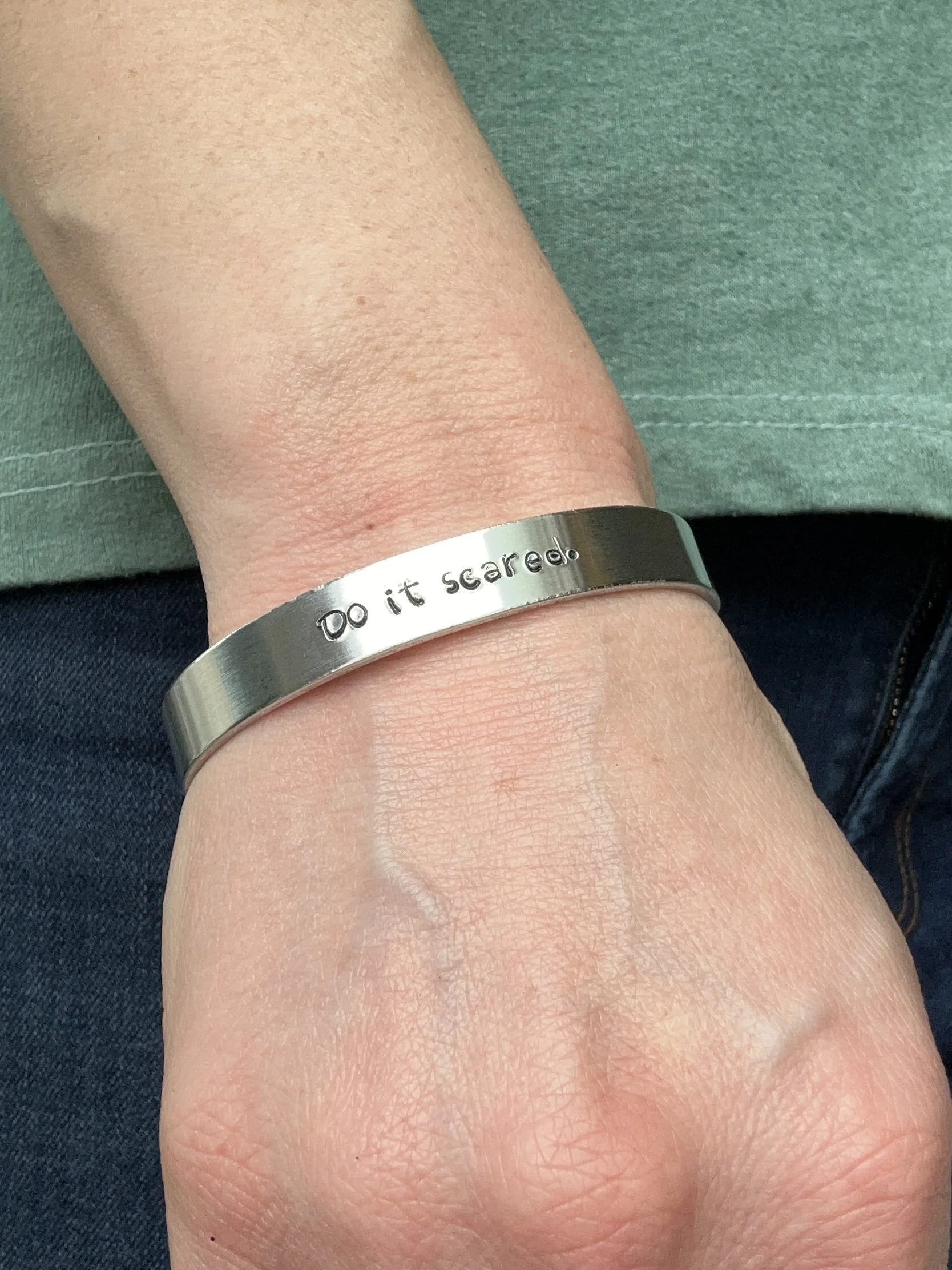 This aluminum cuff has been hand stamped with the phrase “Do it scared,” a reminder that many of the best things in life come out of the things that scare you the most.