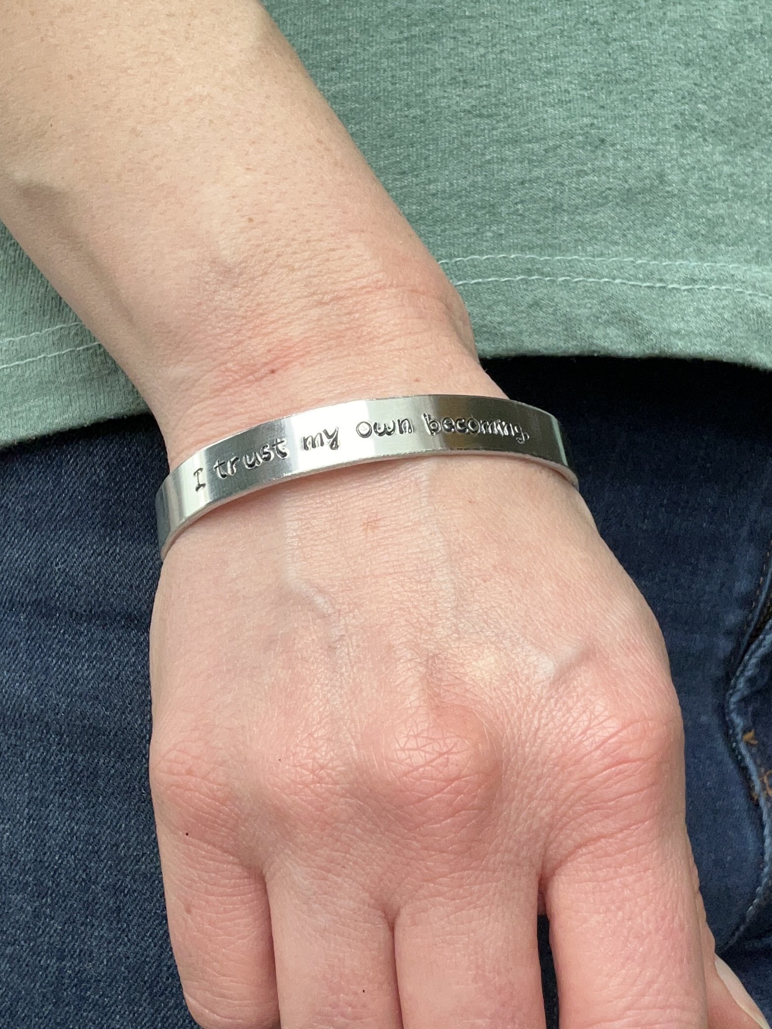 This aluminum cuff has been hand-stamped with the affirmation “I trust my own becoming.”