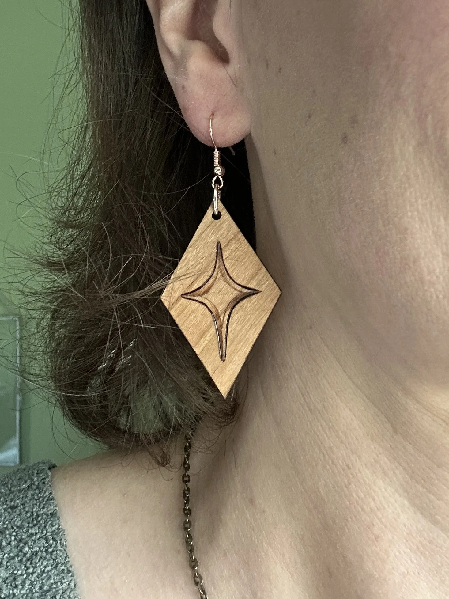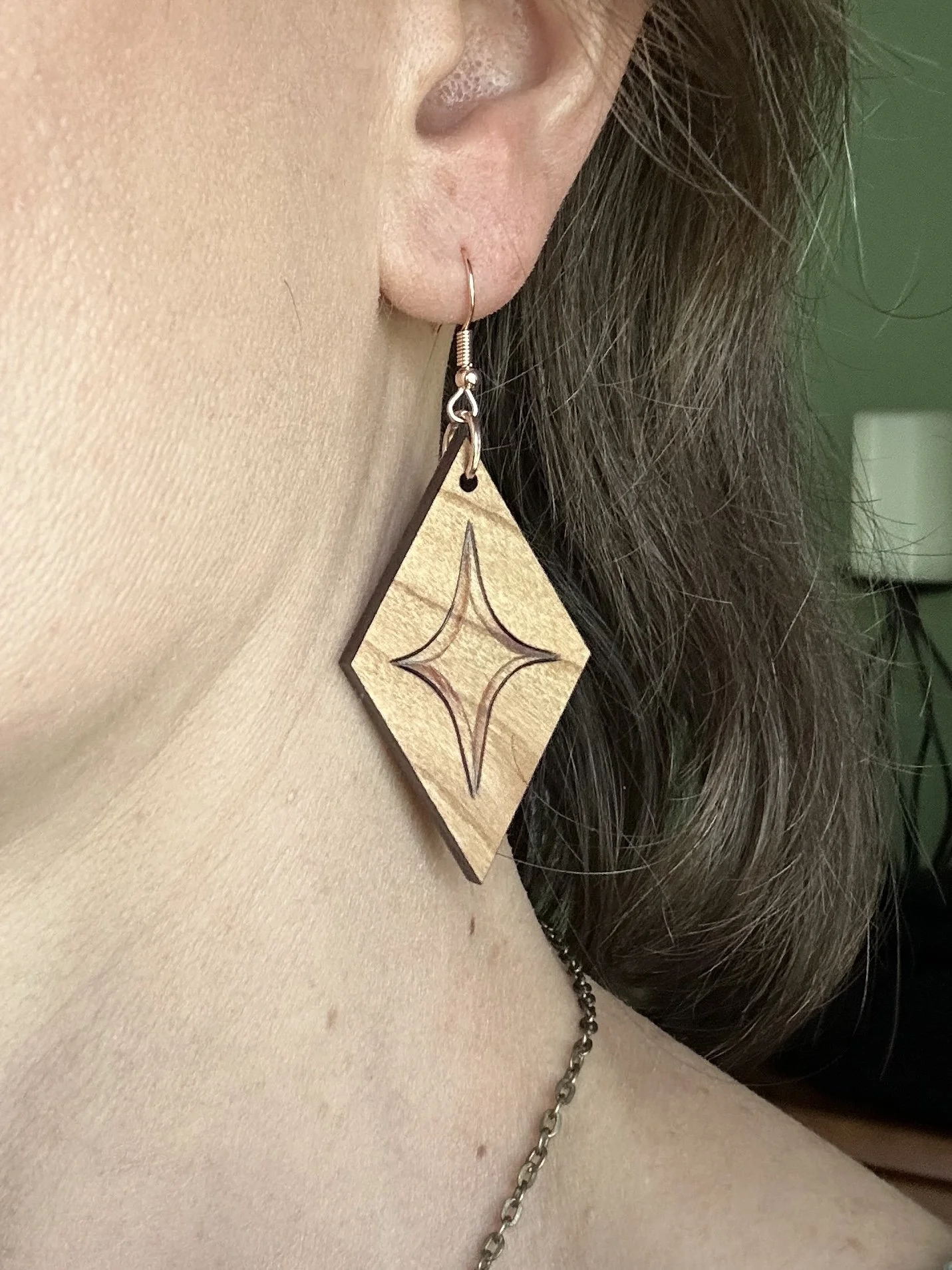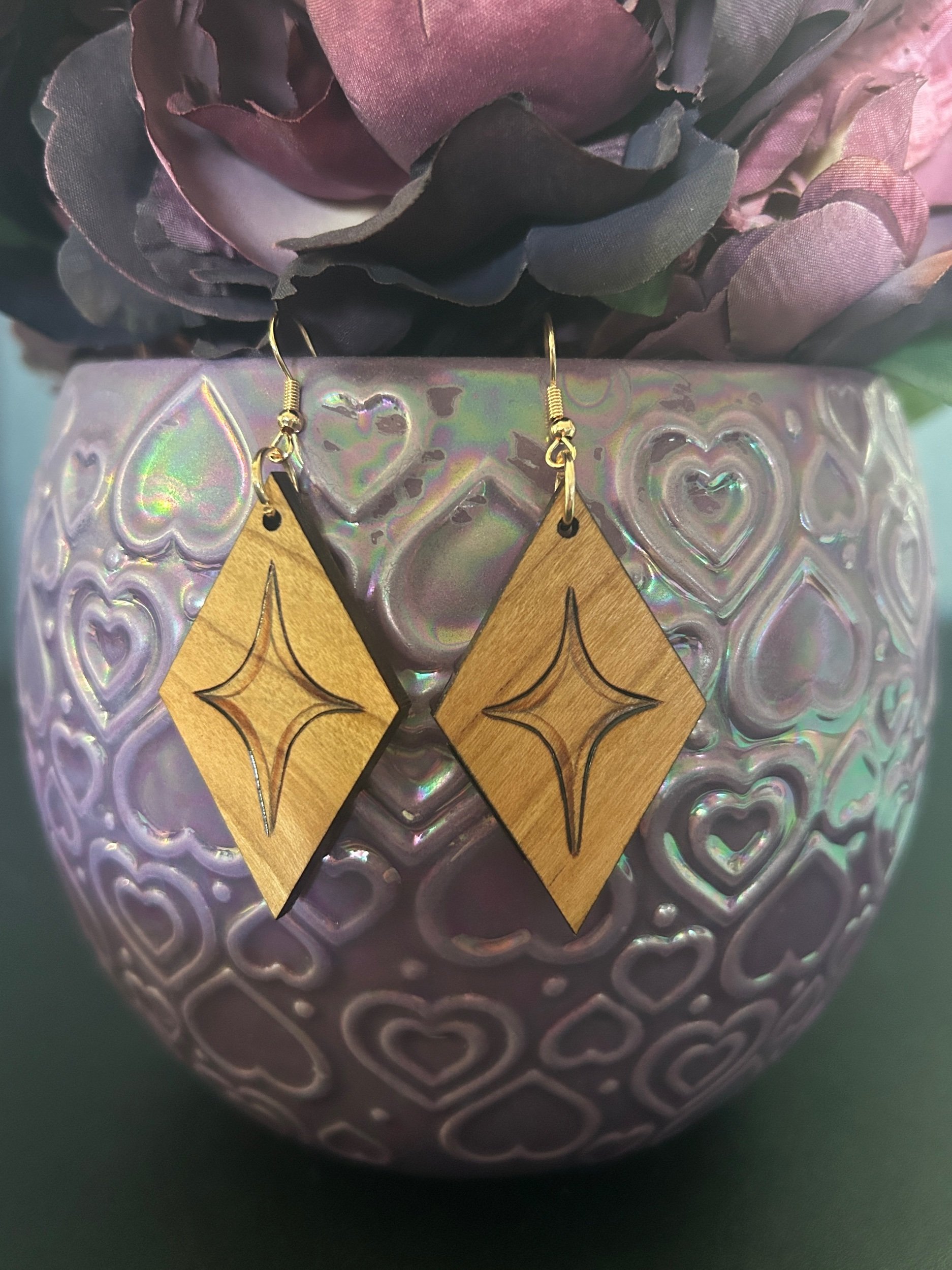 A simple but elegant diamond design has been hand-burned onto cherry wood pendants worked into these earrings. The design is evocative of both sparkling stars and beautiful gemstones, giving these a versatile look that can be incorporated into elegant attire as easily as they can a more casual look. A wonderful gift or treat for yourself!